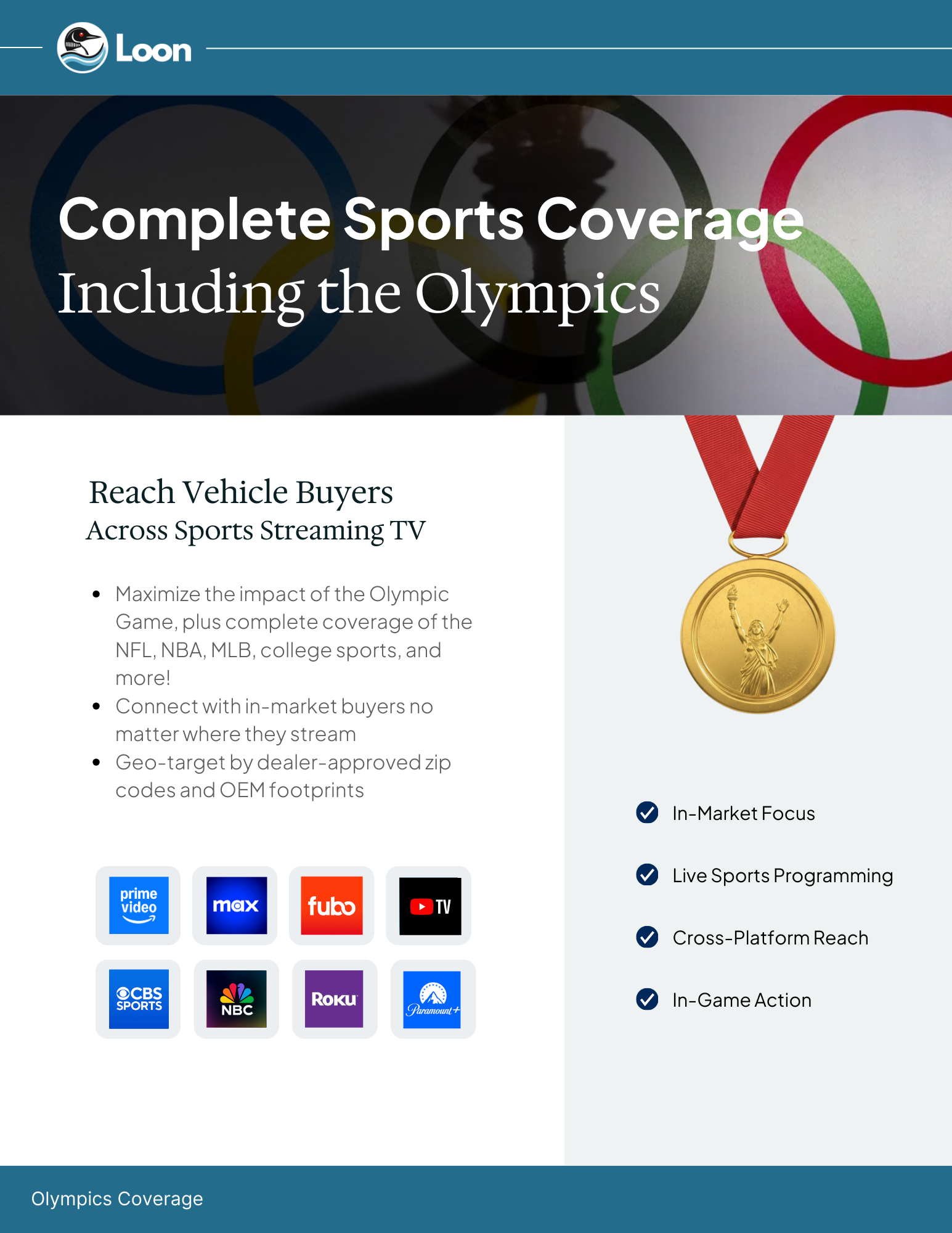 - Omnichannel Sports Coverage allows brands to maximize impact during global events like the Olympic Games and major leagues like the NFL, NBA, and MLB.